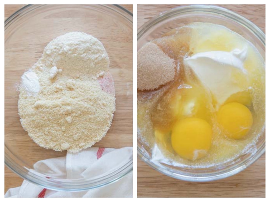 材料有:酸奶油、香草精、藍莓、蛋、奶油、羅漢果糖、杏仁粉、椰子粉、鹽、泡打粉