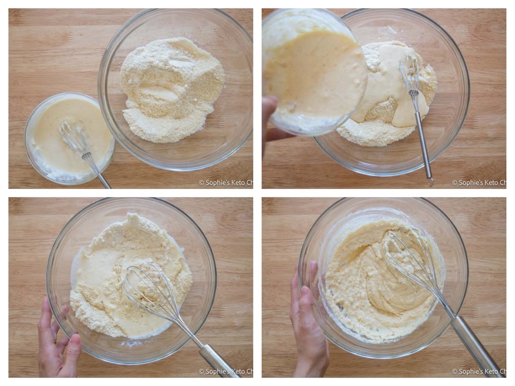 - 在攪拌盆中加入杏仁粉、椰子粉、泡打粉、鹽,混合均勻